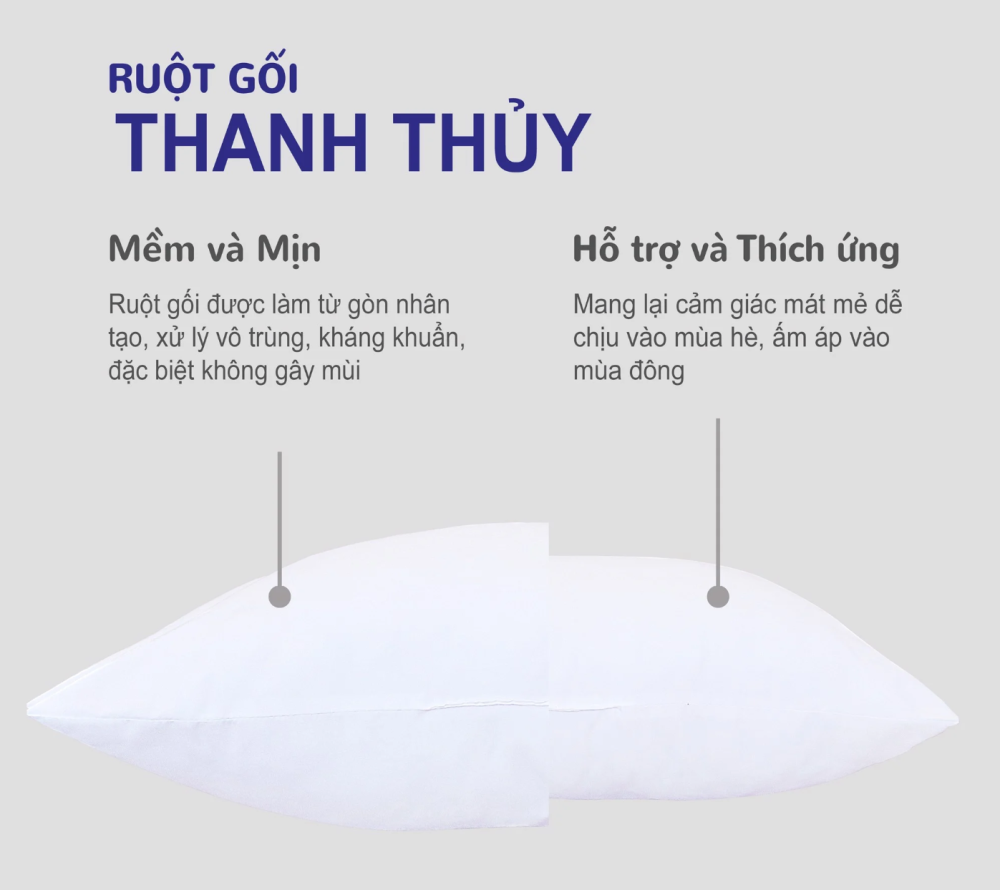 Chất liệu: ruột gối được làm bằng sợi polyester theo dạng vón bi, tạo độ bồng tốt, lâu xẹp, đảm bảo các tính năng về độ tinh, sạch, tốt cho sức khỏe. Sợi bông nhỏ mịn, thông thoáng, hút mồ hôi, tạo cảm giác êm ái, nhẹ nhàng khi sử dụng và không bị vón cục cho dù giặt gối bằng máy giặt thông thường
